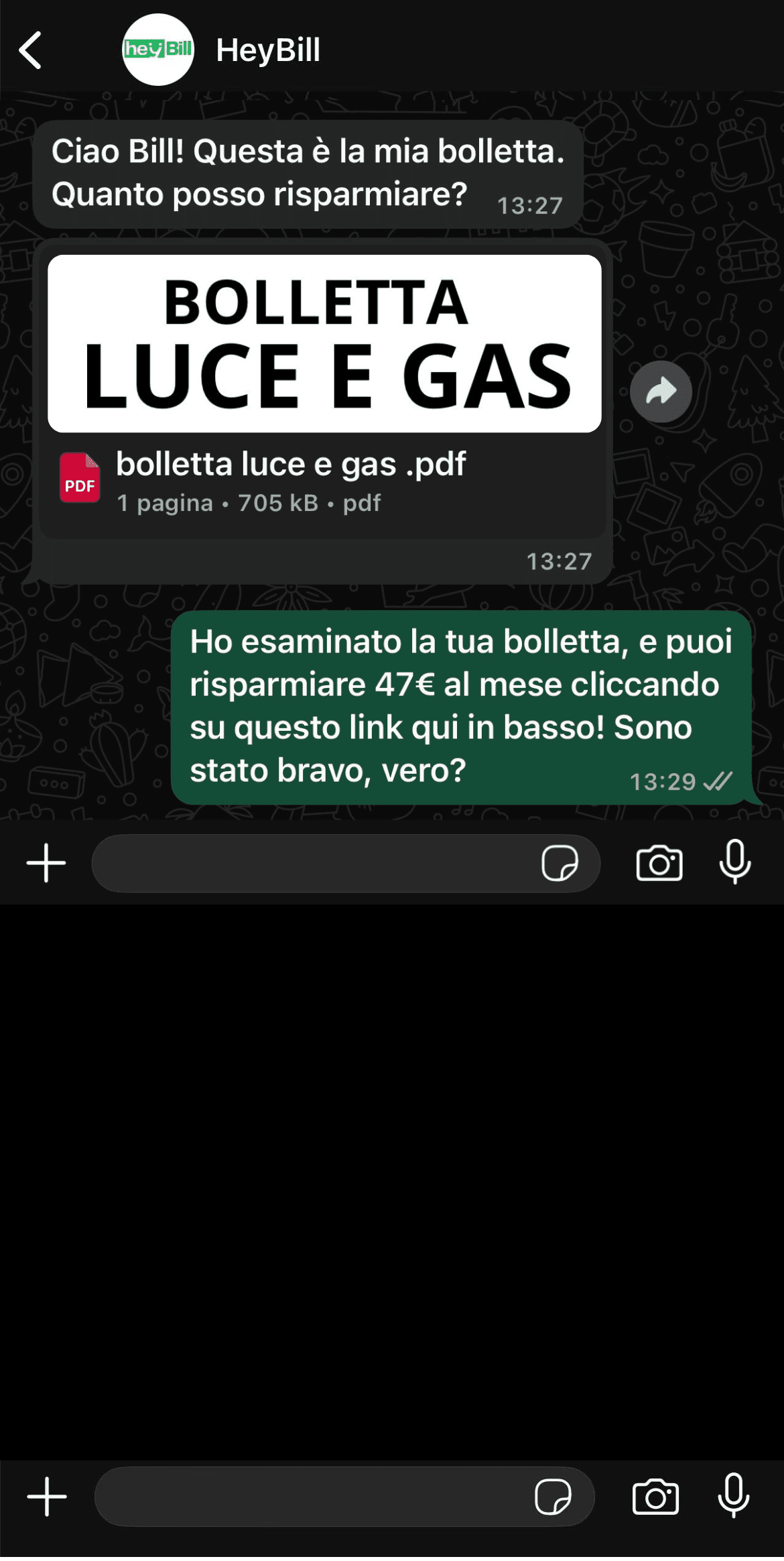 “Zero sbatti: gli mandi la bolletta su WhatsApp, lui ti dice dove risparmi, clicchi e hai già cambiato. Fine.”